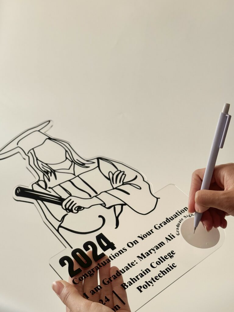 A topper made of black acrylic with white acrylic, used for rose bouquets or photographing graduates